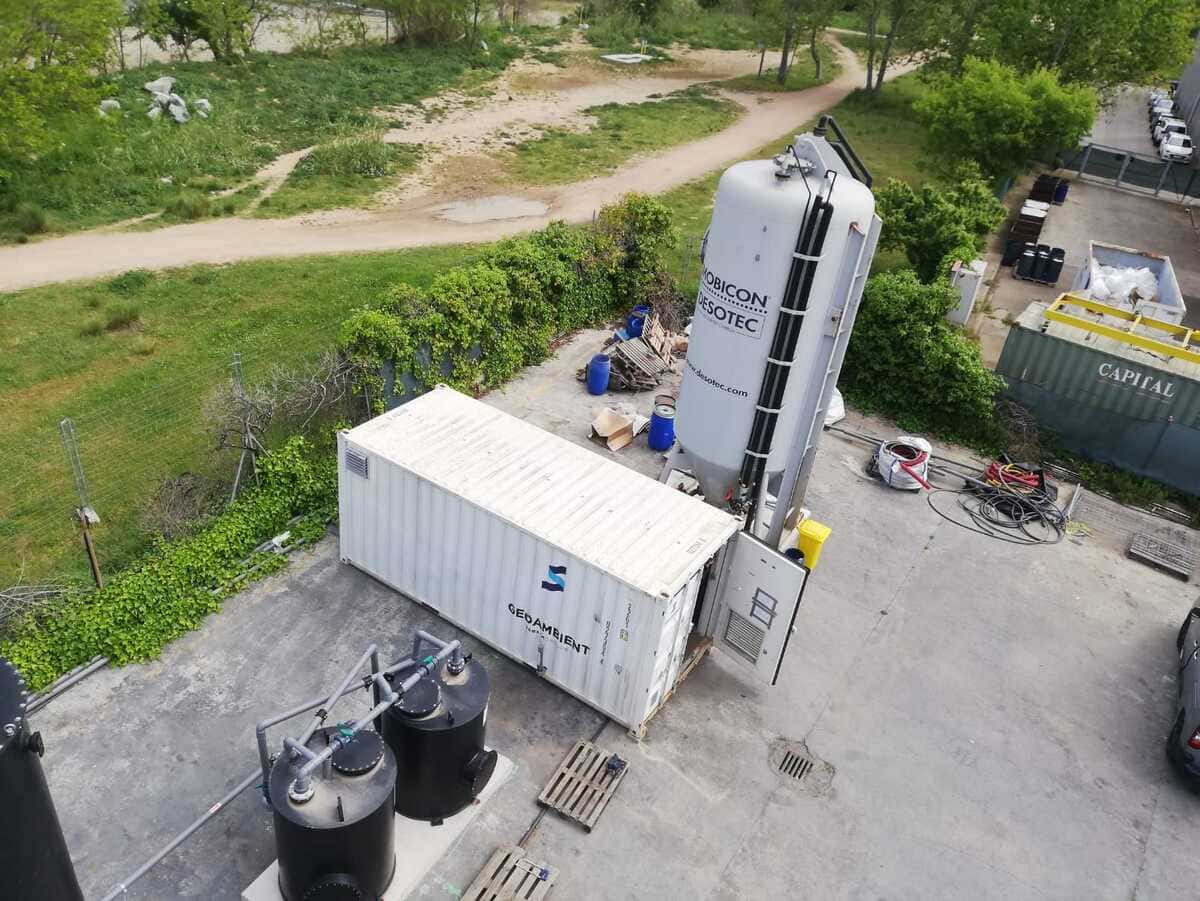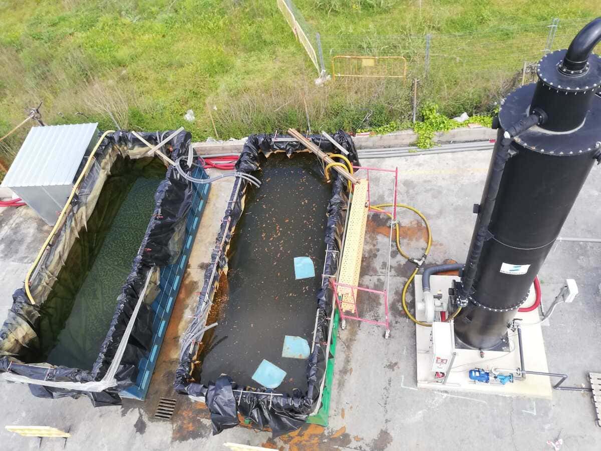 - El procés comença amb una decantació i homogeneïtzació en un tanc de 30 m³ amb sondes de nivell. Les bombes de transvasament condueixen l’aigua cap a una torre d’stripping (36 m³/h) on se separen les fases volàtil i líquida.